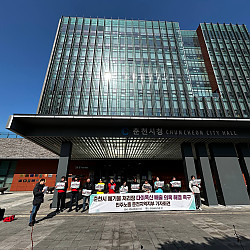 지난 3월 4일, 민주노총 춘천지역지부는 춘천시청 앞에서 춘천시환경사업소 내 다이옥신 자체조사 결과를 공개하고, 춘천시 환경사업소에서 일하는 노동자들의 건강권이 지켜질 수 있도록 안전대책을 마련할 것을 촉구하는 기…