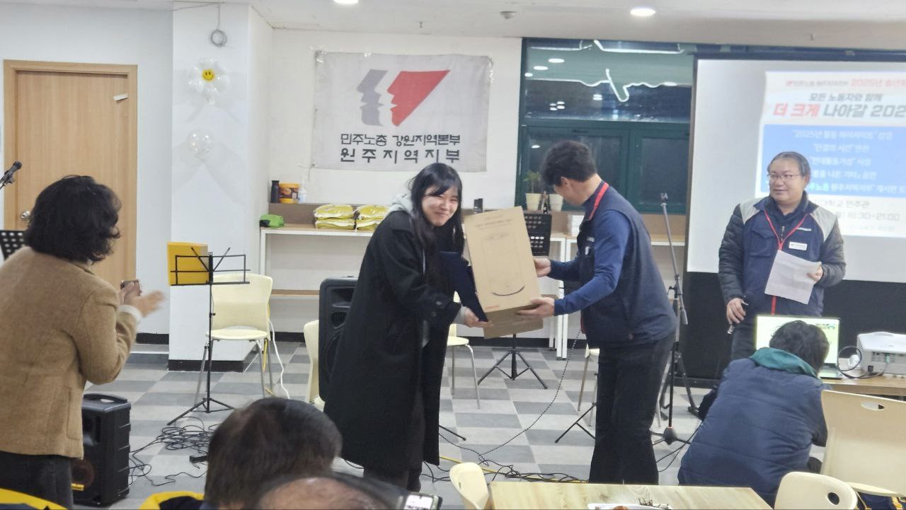 [원주소식] 2025년 민주노총 원주지역지부 송년회 민주노총 원주지역지부는 지난 12월 22일(월) 2025년 송년회를 진행했습니다. 올해의 활동을 돌아보고 내년의 투쟁을 약속하는 자리였습니다. 내년에도 모든 노동자와 함께! 더 크게 나아가는 민주노총 원주지역지부가 되겠습니다. 동지들의 많은 응원과 참여 부탁드립니다!