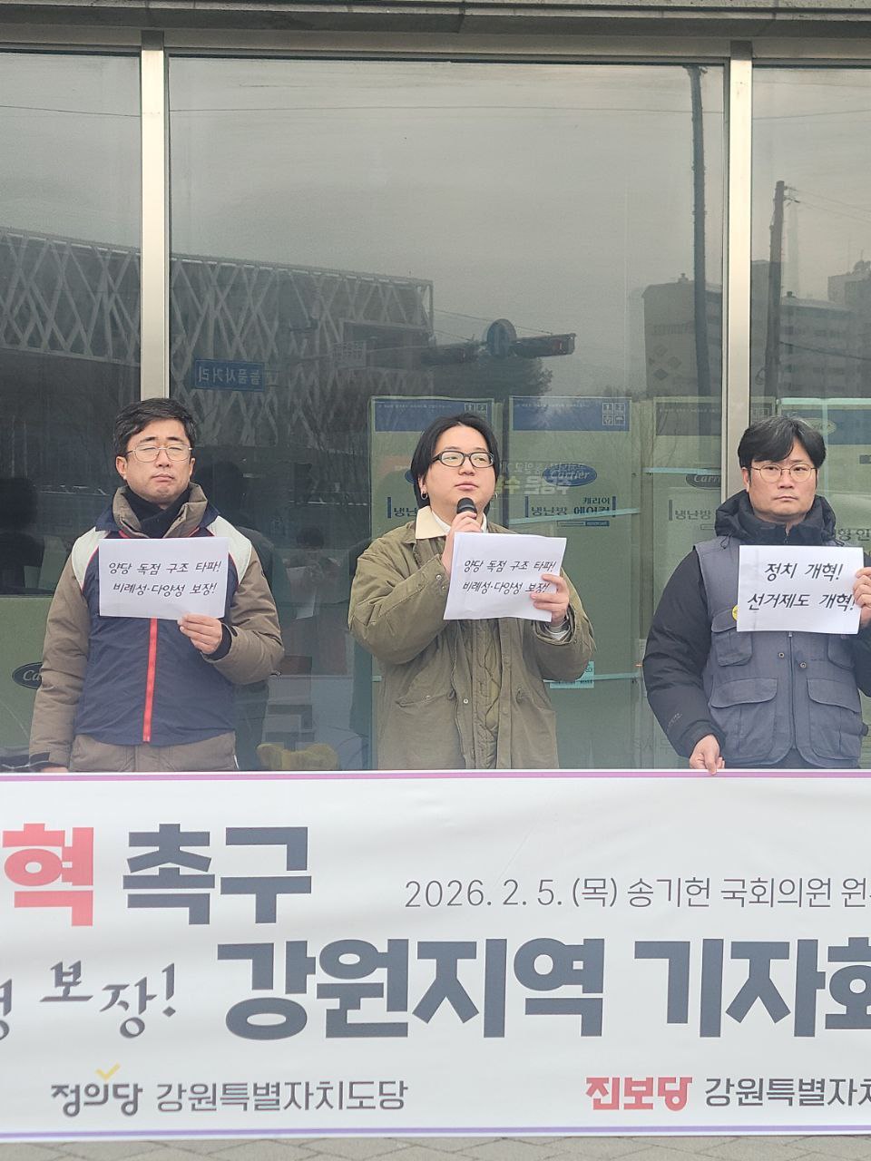 민주노총 강원지역본부는 2월 5일 오전 10시, 송기헌 의원(국회 정치개혁특별위원회 위원장) 원주 사무소 앞에서 "선거제도 개혁! 정치개혁! 촉구 강원지역 기자회견"을 진행하였습니다. 강원녹색당, 정의당 강원도당, 진보당 강원도당과 함께 하였습니다.