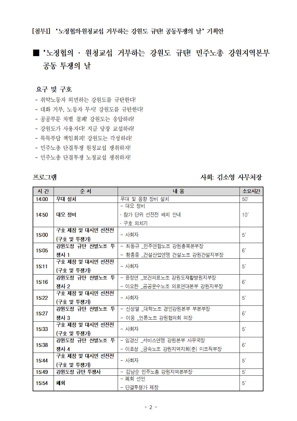 [보도자료] 노정협의,원청교섭 거부하는 강원도 규탄! 민주노총 강원지역본부 공동투쟁의 날 진행 2026.04.15 16:57 260401_보도자료_강원도_규탄_민주노총_강원지역본부_공동투쟁의_날.hwp (47.0K) + 1
