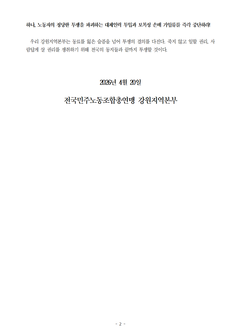 [성명] 노동자를 죽음으로 내몬 교섭 거부와 살인진압! CU BGF리테일과 정부를 강력히 규탄한다! 2026.04.20 17:43 260420_성명_노동자를_죽음으로_내몬_교섭_거부와_살인진압_CU_BGF리테일과_정부를_강력히_규탄한다.hwp (114.0K) + 2