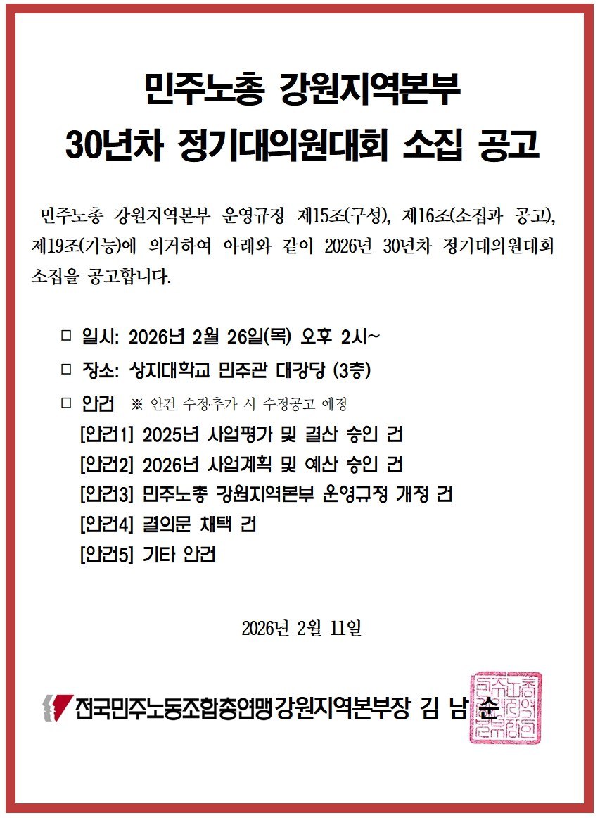 [공고] 2026년 민주노총 강원지역본부 30년차 정기대의원대회 소집 공고 > 공지사항