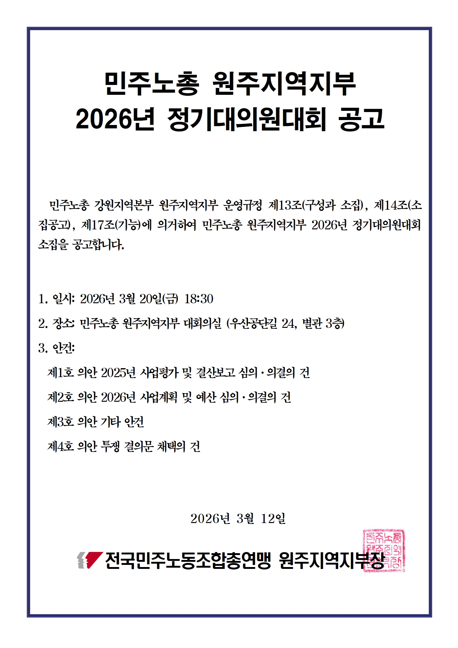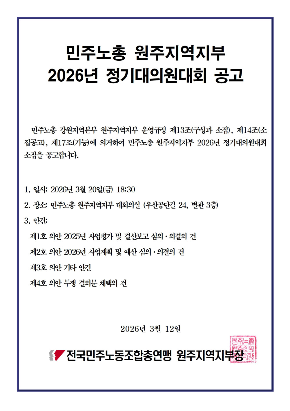 [공고] 민주노총 원주지역지부 2026년 정기대의원대회 소집 공고