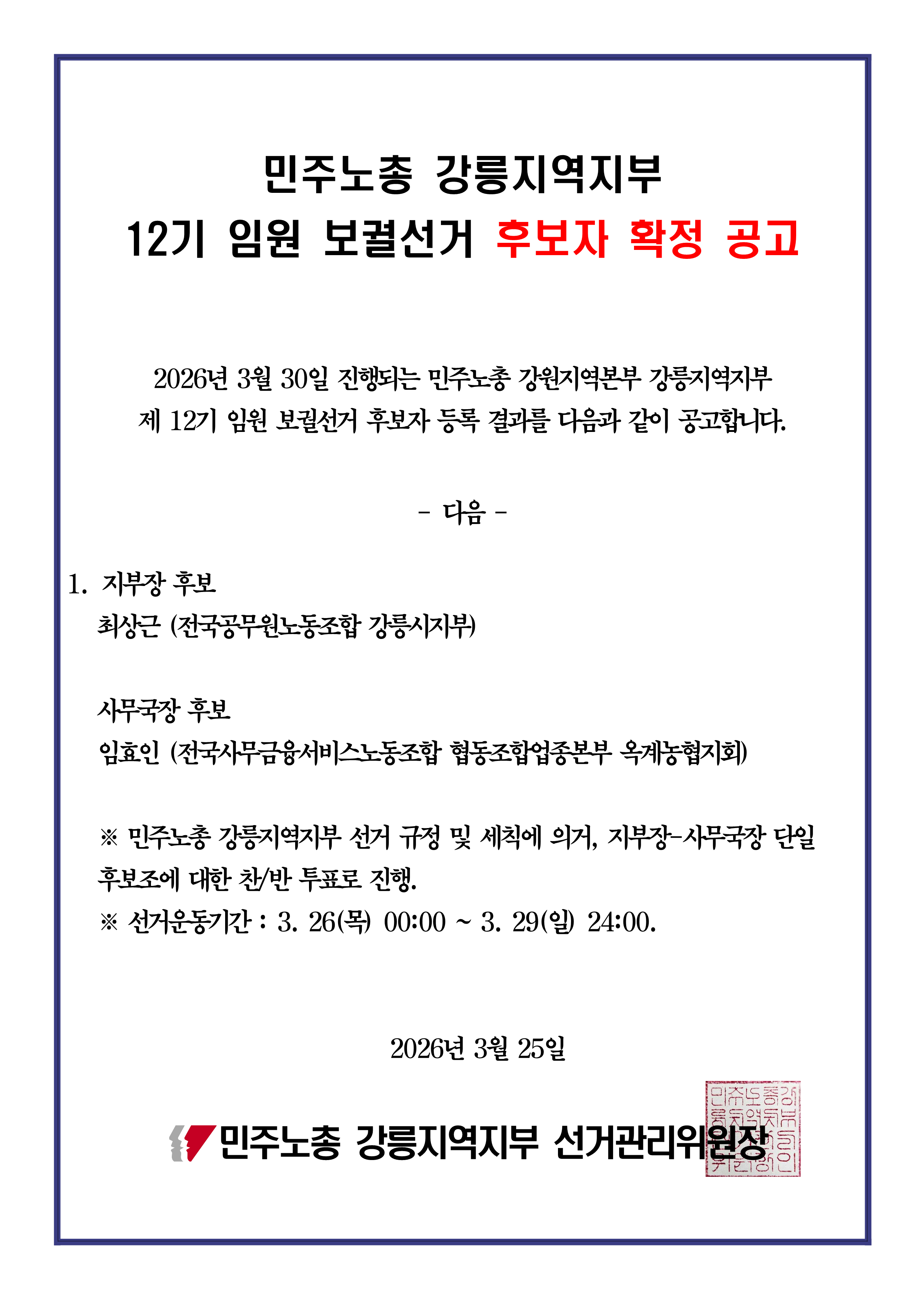 [공고]민주노총 강릉지역지부 12기 임원 보궐선거 후보자 확정 공고